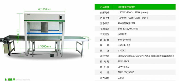 一半以上的客戶選擇食用菌專用流水線接種超凈工作臺,它有怎樣的優勢呢?1、食用菌專用流水線接種超凈工作臺設備總長為:3500*620*1720,其中超凈工作臺的尺寸為:1500mm*800mm*1720mm,這樣設計的原因是為了更好的適用食用菌生產工藝的流程。2、食用菌專用流水線接種超凈工作臺采用軟觸點控制面板開關,三擋調速。3、皮帶末端裝有光電感應,已接種好的菌種不易滑落至地面。4、設備內有紫外線和照明燈,開關獨立控制。5、200W國產渦輪蝸桿電機,速比:1:10,變頻調速,速度2-6 m/min。6、單間輸送產品4KG/件。7、流水線采用電柜箱控制,分為腳踏按鈕和手動按鈕開關控制,設計更人性化。8、皮帶寬度530mm,厚度2mm,綠色防靜電皮帶,皮帶托輥采用304不銹鋼滾筒。